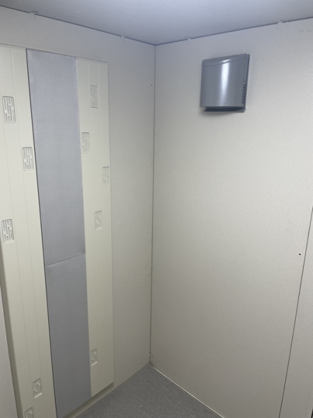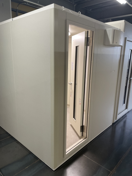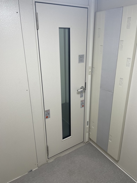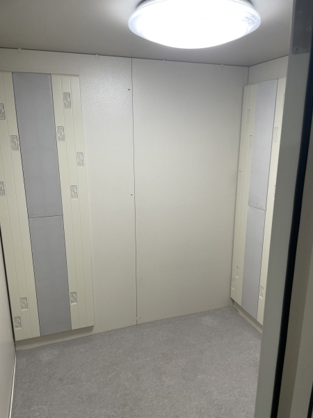 | 仕様 | 床:防振ゴム+高剛性床パネル+遮音床パネル、カーペット仕上げ 壁:遮音壁パネル 内外装仕上げ:オレフィンシート(ホワイト系) コーナー保護カバー:ABS樹脂押出材(ホワイト系) 天井:遮音天井パネル、内外装仕上げ:オレフィンシート(ホワイト系) ドア:木製防音ドア(2重透明ガラス窓付き)・内外装仕上げ:オレフィンシート(ホワイト系) 装備:照明・換気扇・2口コンセント・音場パネル |