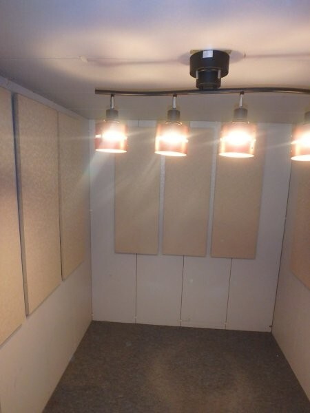 | 仕様 | 床:底床・遮音床パネル・カーペット仕上げ 壁・天井:遮音壁パネル・内装仕上げ:化粧紙(天井:ホワイト系) 外装仕上げ:化粧紙(ホワイト系) ドア:木製防音ドア(2重透明ガラス窓付)・表面:化粧紙仕上げ 装備:照明・換気扇・2口コンセント・FIX窓・音場パネル |