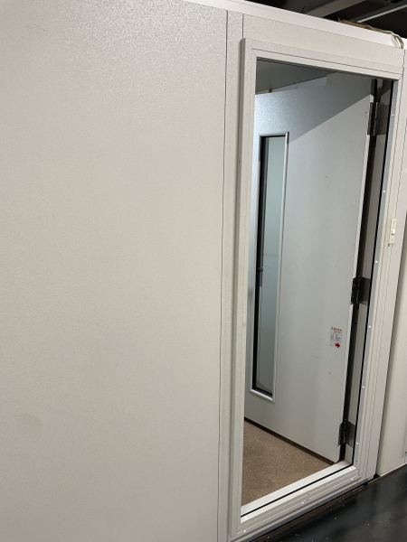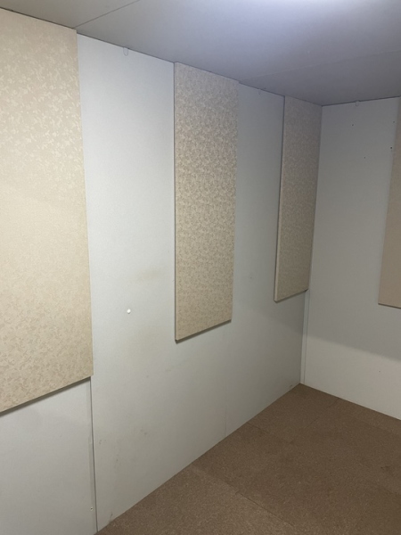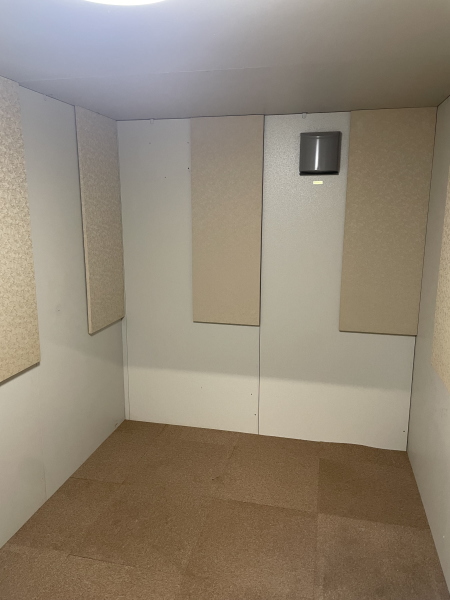| 仕様 | 床:防振ゴム+床フレーム+高剛性床パネル+遮音床パネル・カーペット仕上げ 壁:遮音壁パネル・外装仕上げ:化粧紙(パールホワイト色) コーナー化粧柱:パールホワイト色 天井:遮音天井パネル・外装仕上げ:化粧紙(パールホワイト色) ドア:木製防音ドア(2重透明ガラス窓付き)・表面:化粧紙仕上げ(パールホワイト色) 装備:換気扇・2口コンセント・照明・音場パネル |