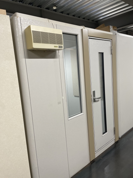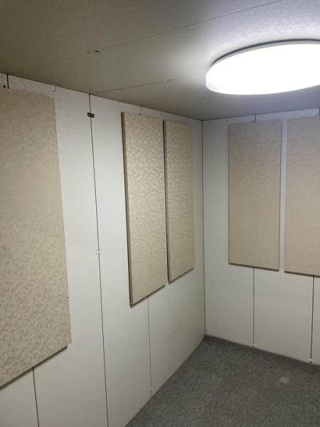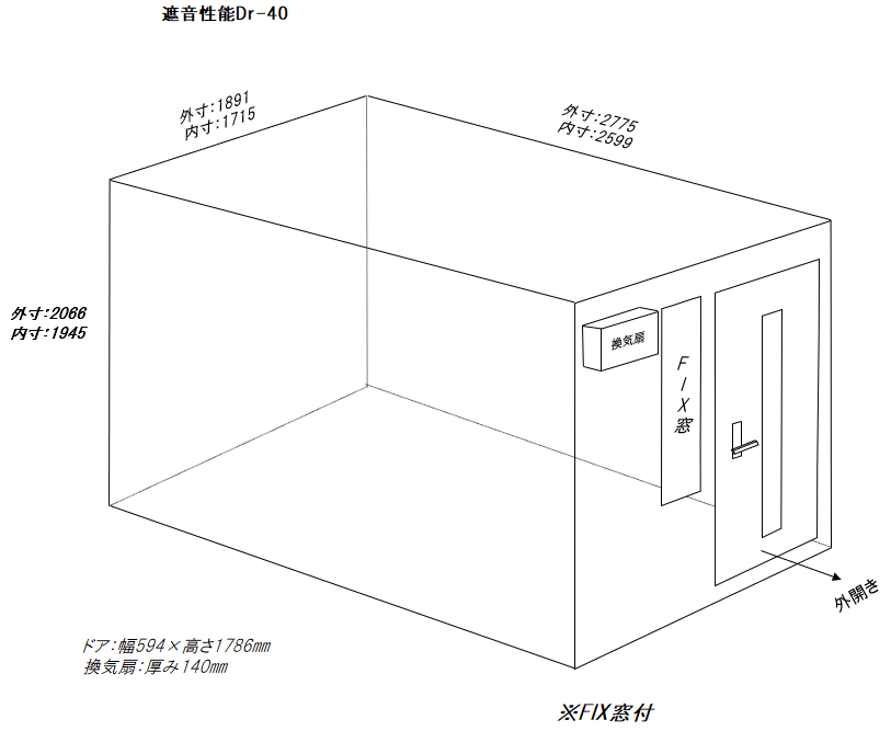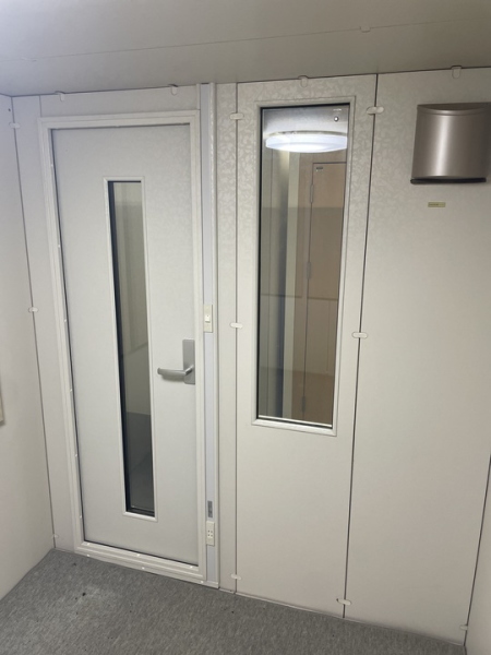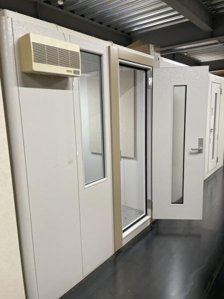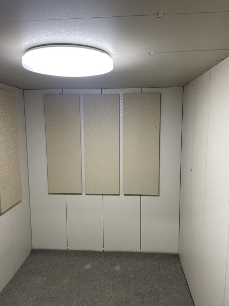 | 仕様 | 床:底床+遮音床パネル・カーペット仕上げ 壁:遮音壁パネル・外装仕上げ:化粧紙(ホワイト系) 天井:遮音天井パネル・内装仕上げ:化粧紙(天井:グリーン系) 外装仕上げ化粧紙(ホワイト系) ドア:木製防音ドア(2重透明ガラス窓付き) 表面:化粧紙仕上げ・ゲート:ピンク 装備:照明・換気扇・2口コンセント・音場パネル・FIX窓 |