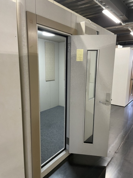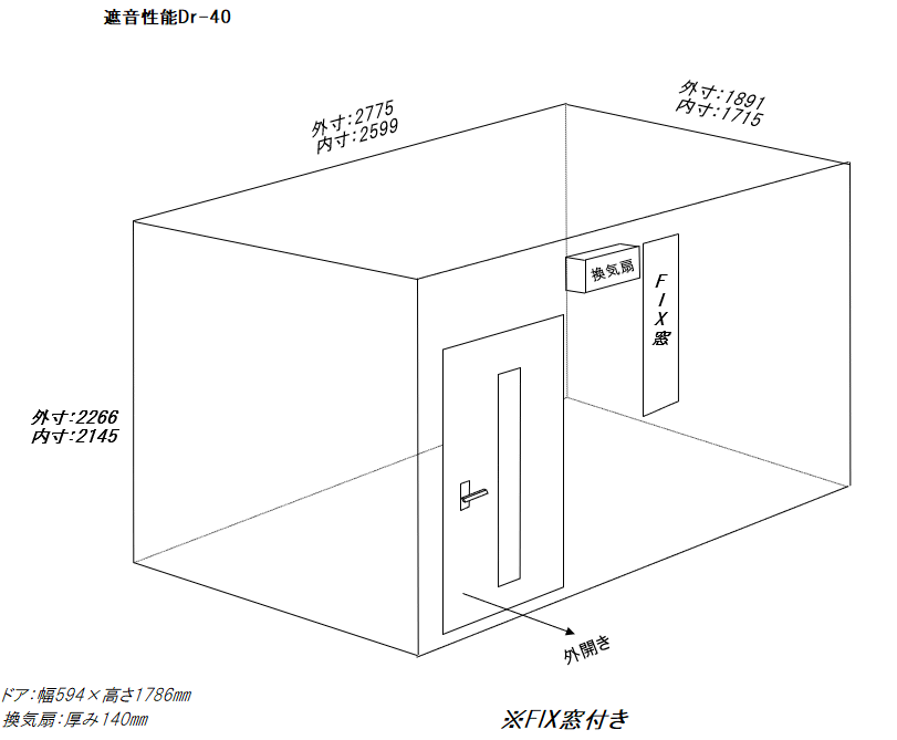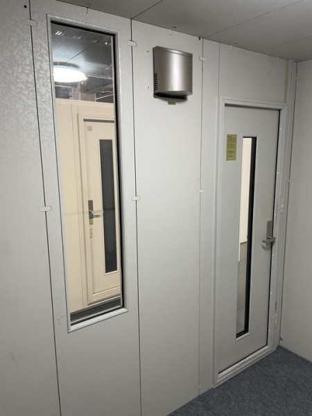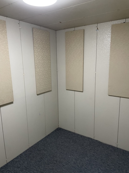| 仕様 | 床:底床+遮音床パネル・カーペット仕上げ 壁:遮音壁パネル・外装仕上げ:化粧紙(ホワイト系) 天井:遮音天井パネル・外装仕上げ化粧紙(ホワイト系) ドア:木製防音ドア(2重透明ガラス窓付き)・表面:化粧紙仕上げ・ゲート:ベージュ 装備:照明・換気扇・2口コンセント・音場パネル・FIX窓 |