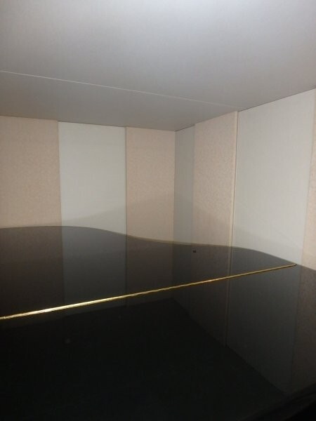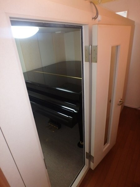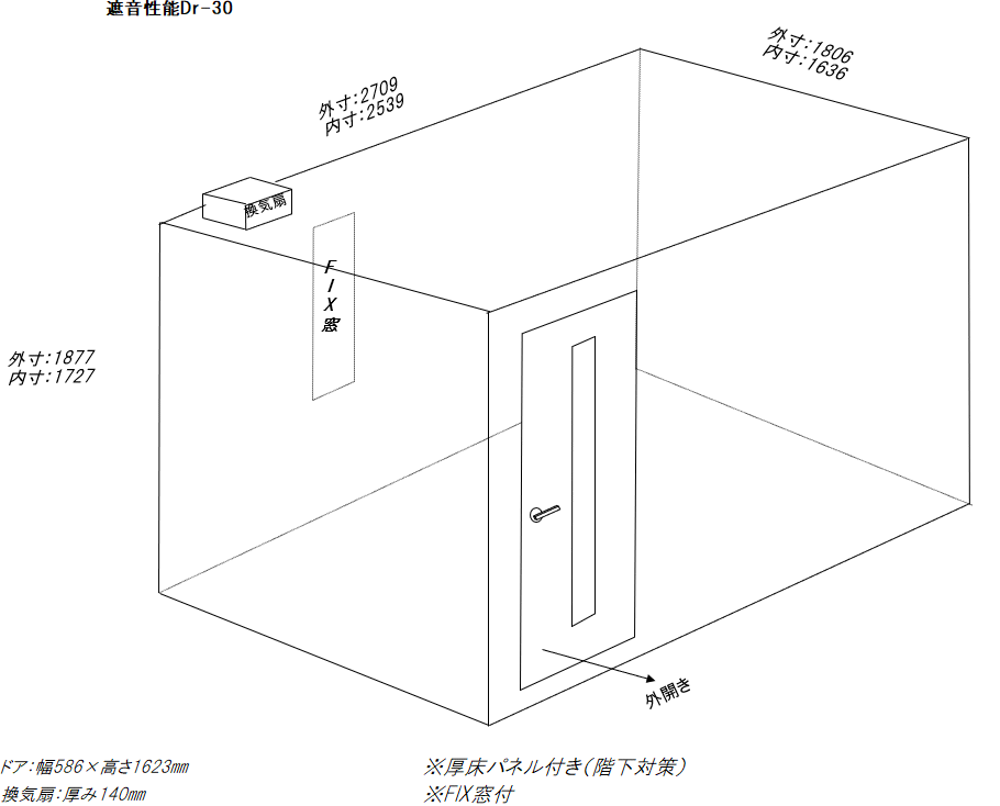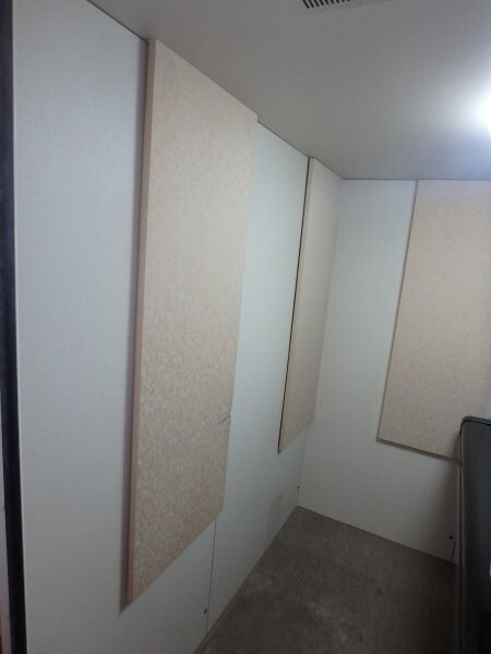 | 仕様 | 床:床下合板+底床+遮音床パネル+厚床パネル・カーペット仕上げ 壁:音場壁パネル・布クロス仕上げ 天井:天井パネル・ビニールクロス仕上げ(ホワイト系) ドア:木製防音ドア(透明ガラス窓付き)・塩ビシート仕上げ(アイボリー系) 装備:照明・換気扇・2口コンセント・音場パネル・FIX窓 |