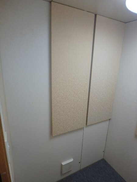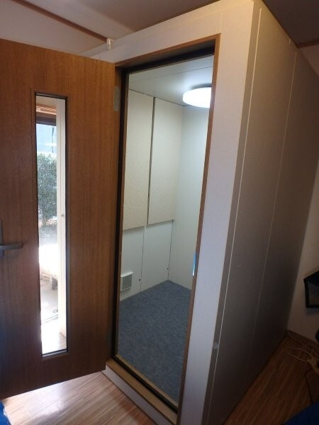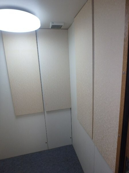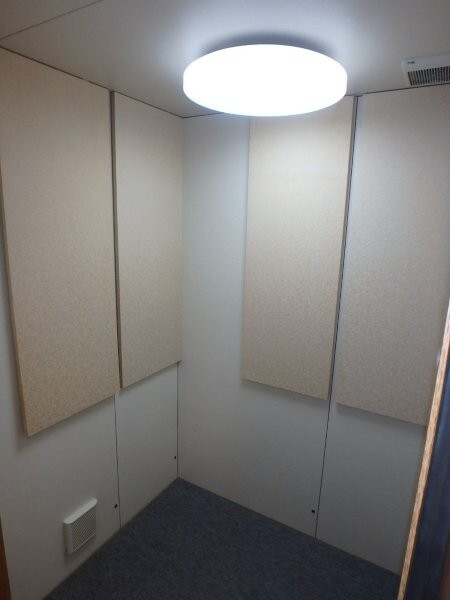 | 仕様 | 床:底床・遮音床パネル・カーペット仕上げ 壁:遮音壁パネル 無機質壁紙仕上げ カラー:ホワイト 天井:遮音天井パネル 無機質壁紙仕上げ カラー:ホワイト ドア:木製防音ドア(2重透明ガラス窓付き)・塩ビシート仕上げ(木目調) 装備:照明・換気扇・2口コンセント・音場パネル |