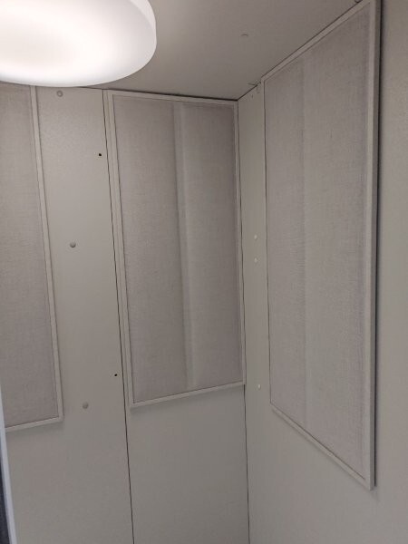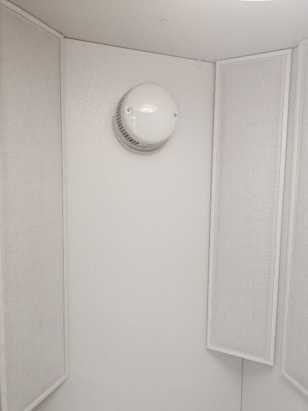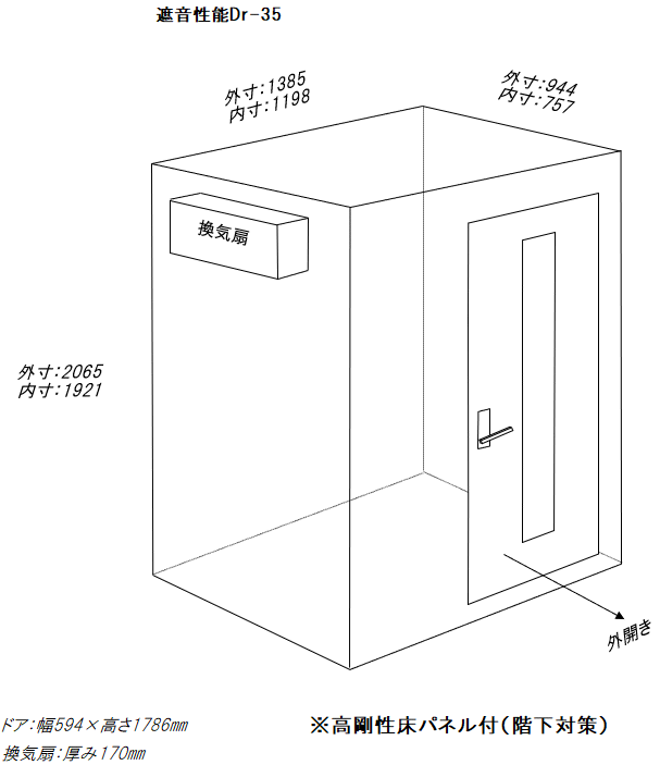 | 仕様 | 床:底床+遮音床パネル+高剛性床パネル・カーペット仕上げ 壁:遮音壁パネル・内外装仕上げ:強化化粧紙(パールホワイト色) コーナー/化粧カバー:ABS樹脂押出材 天井:遮音天井パネル 内外装仕上げ:強化化粧紙(パールホワイト色) ドア:木製防音ドア(透明ガラス窓付き)・ 表面:強化化粧紙仕上げ(パールホワイト色) 装備:照明・換気扇・2口コンセント・音場パネル・コーナー音場パネル |