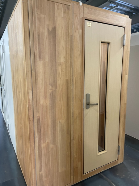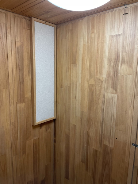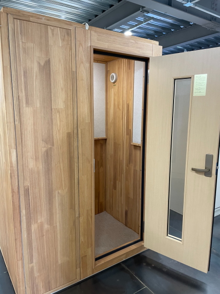 | 仕様 | 床:底床+遮音床パネル・カーペット仕上げ 壁:遮音壁パネル 桐(天然ポリウレタン塗装仕上げ) 天井:遮音天井パネル 桐(天然ポリウレタン塗装仕上げ) ドア:木製防音ドア(透明ガラス窓付き)・強化化粧紙仕上げ(木目調) 装備:照明・換気扇・2口コンセント・音場パネル |
