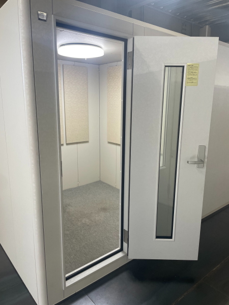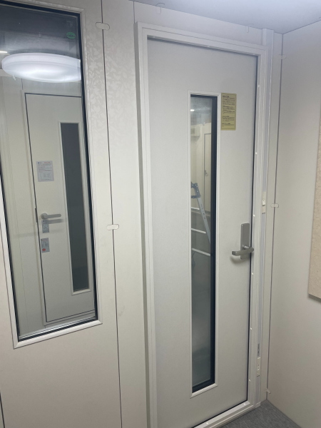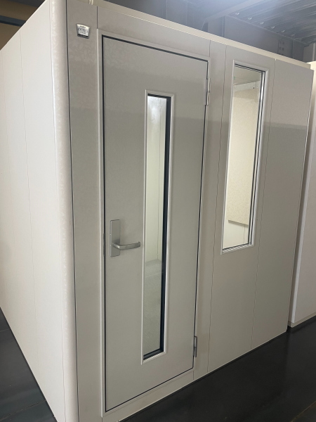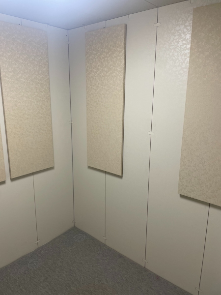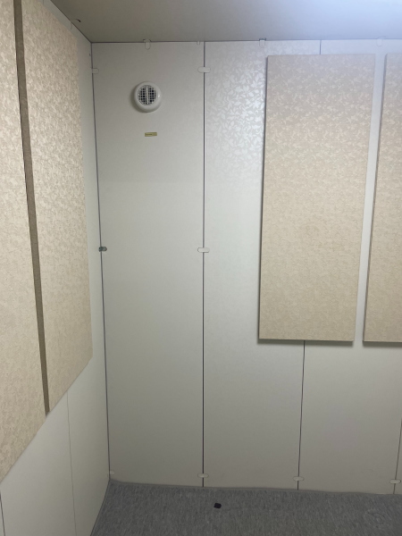 | 仕様 | 床:遮音床パネル+遮音床パネル・カーペット仕上げ 壁・天井:遮音壁パネル・内装仕上げ:化粧紙(天井:ホワイト系) 外装仕上げ:化粧紙(ホワイト系) ドア:木製防音ドア(2重透明ガラス窓付き)・表面:化粧紙仕上げ 装備:照明・換気扇・2口コンセント・FIX窓・音場パネル |