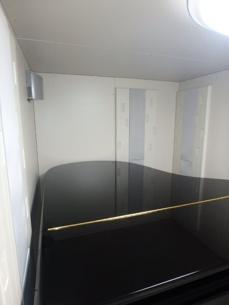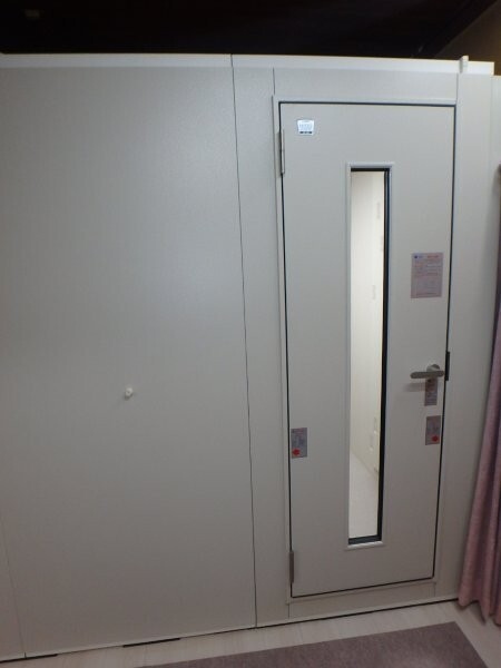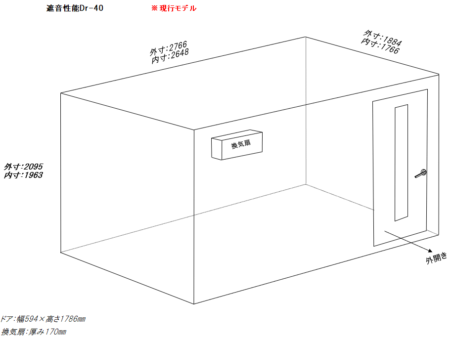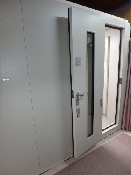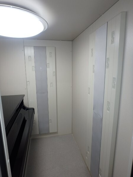 | 仕様 | 床:底床+防振ゴム+床フレーム+遮音床パネル、カーペット仕上げ 壁:オレフィンシート(ホワイト系)、コーナー保護カバー:ABS樹脂押出材(ホワイト系) 天井:オレフィンシート(ホワイト系) ドア:木製防音ドア (2重透明ガラス窓付き) 装備:照明・換気扇・2口コンセント・音場パネル |