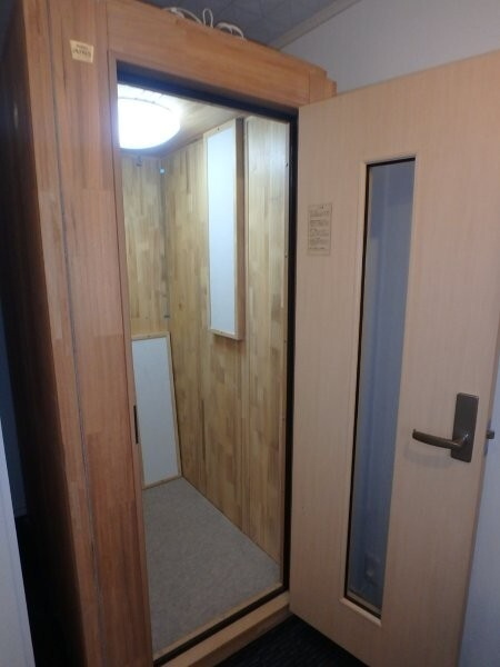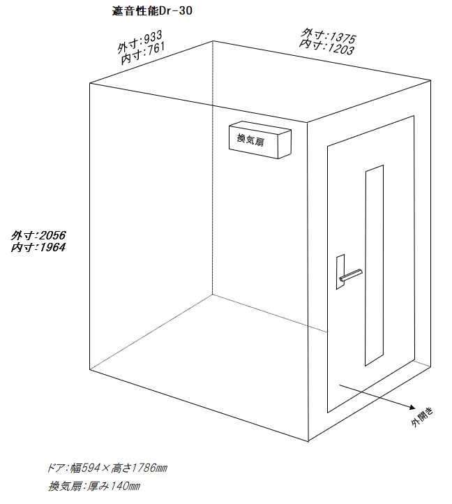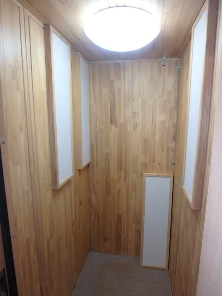 | 仕様 | 床:底床+遮音床パネル・カーペット 壁:遮音壁パネル 桐(天然ポリウレタン塗装仕上げ) 天井:遮音天井パネル 桐(天然ポリウレタン塗装仕上げ) ドア:木製防音ドア(透明ガラス窓付き)・強化化粧紙仕上げ(木目調) 装備:照明・換気扇・2口コンセント・音場パネル |