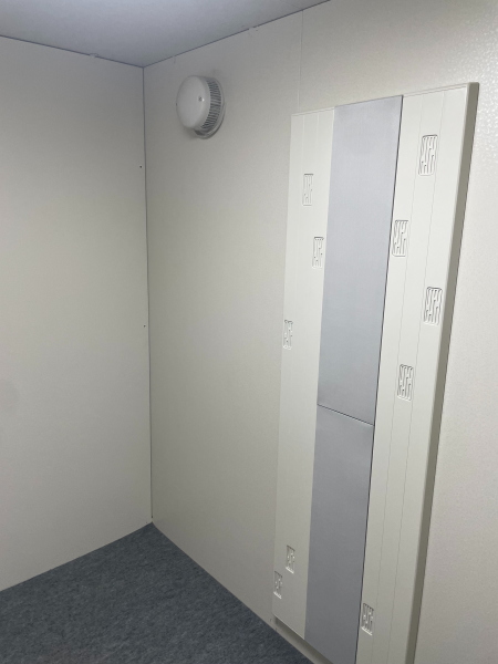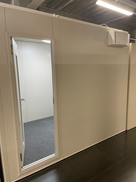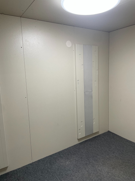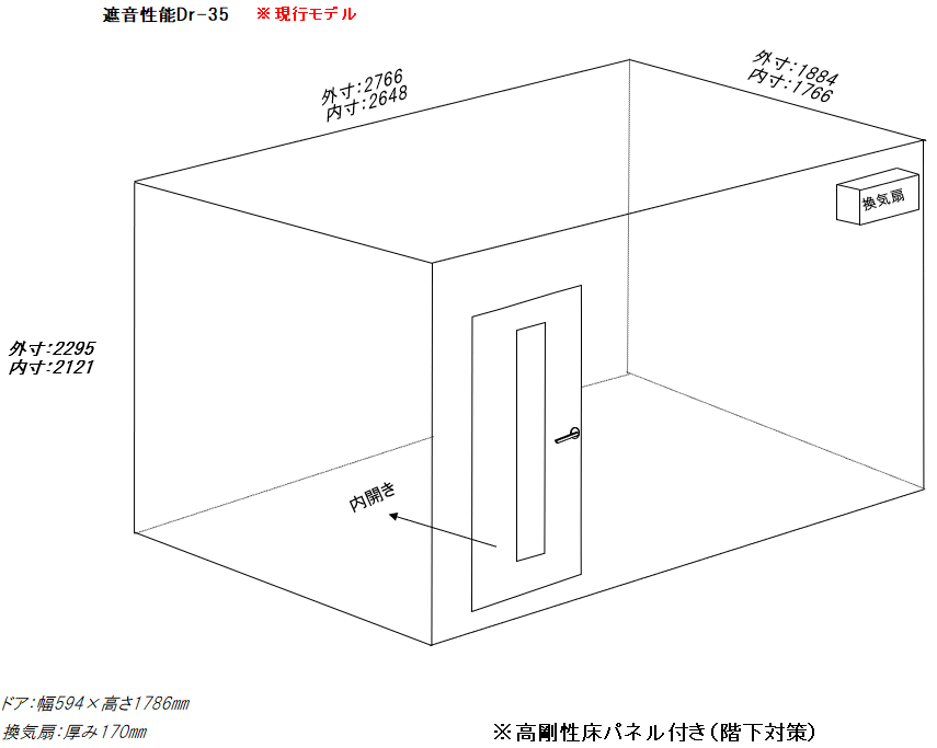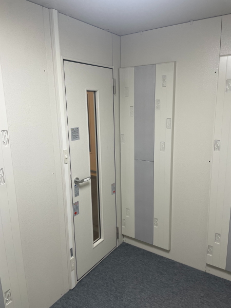 | 仕様 | 床:防振ゴム+床フレーム+高剛性床パネル+遮音床パネル+カーペット仕上げ 壁:遮音壁パネル 内外装仕上げ:オレフィンシート(ホワイト系) コーナー保護カバー:ABS樹脂押出材 天井:遮音天井パネル 内外装仕上げ:オレフィンシート(ホワイト系) ドア:木製防音ドア(透明ガラス窓付)・内外装仕上げ:オレフィンシート(ホワイト系) 装備:照明・換気扇・2口コンセント・音場パネル |