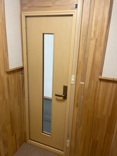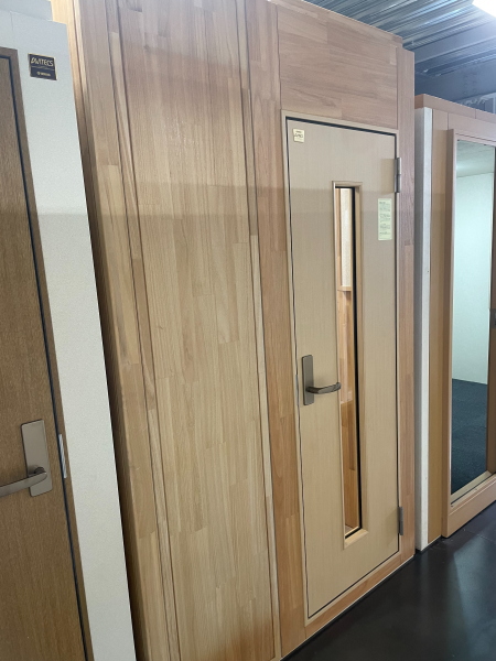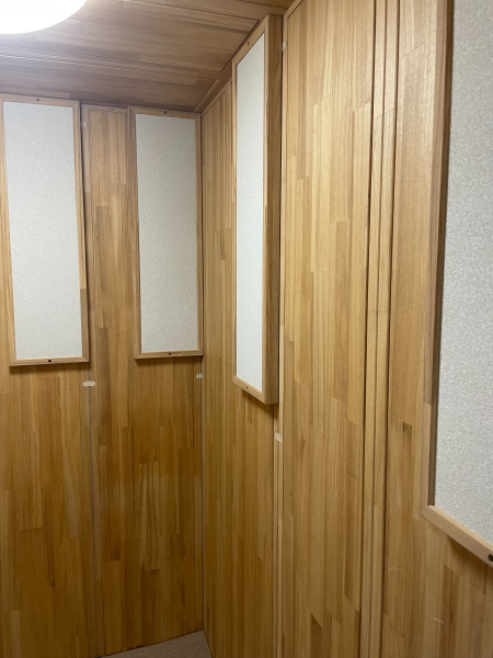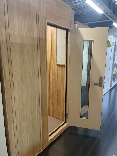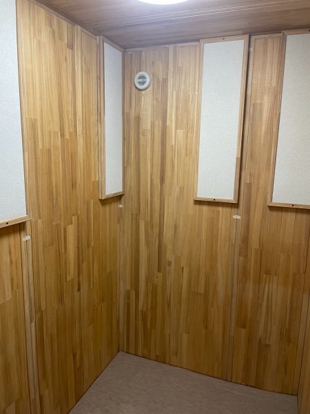 | 仕様 | 床:底床+遮音床パネル・カーペット仕上げ 壁:遮音壁パネル 桐(天然ポリウレタン塗装仕上げ) 天井:遮音天井パネル 桐(天然ポリウレタン塗装仕上げ) ドア:木製防音ドア(透明窓付き)・強化化粧紙仕上げ(木目調) 装備:照明・換気扇・2口コンセント・音場パネル付き |