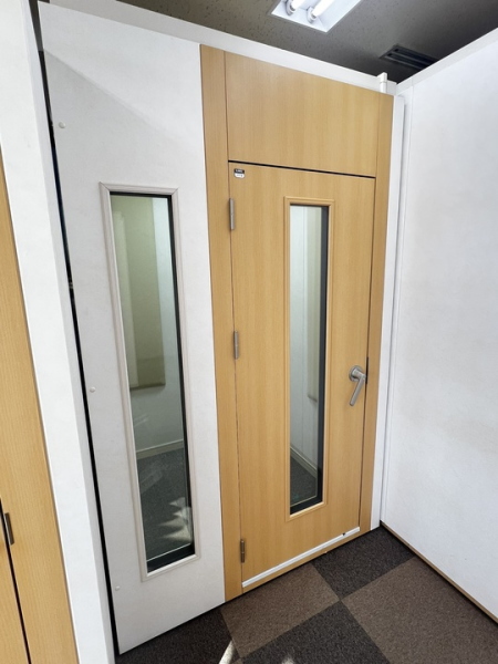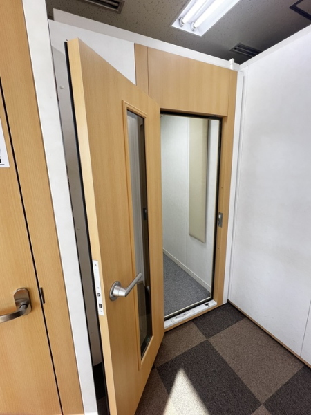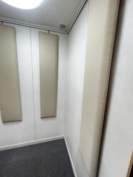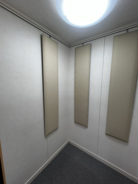| 仕様 | 床:遮音床、タイルカーペット仕上げ 壁:クロス仕上げ、遮音パネル 天井:換気内蔵、クロス仕上げ、遮音パネル ドア:木製防音ドア(2重透明窓付き)・2重ゴムパッキン使用・グレモンハンドル 装備:照明・2口コンセント・2連スイッチ・吸音パネル・FIX窓 |