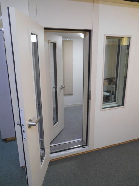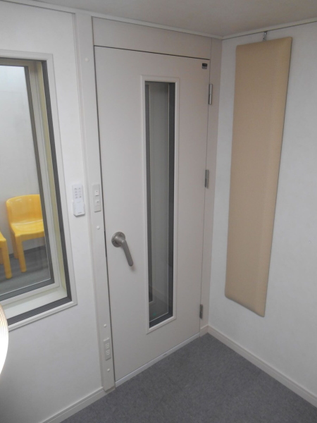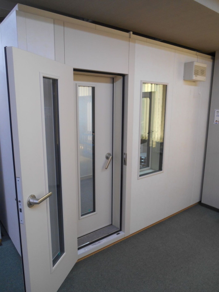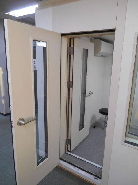 | 仕様 | 床:防振浮床構造・タイルカーペット仕上げ 壁:独立二重壁遮音パネル・クロス仕上げ 天井:独立二重天井遮音パネル・クロス(非塩ビ)仕上げ ドア:木製防音ドア(2重透明ガラス窓)・グレモンハンドル 装備:LED照明器具・換気扇・2口コンセント・FIX窓・吸音パネル 重量:1740kg |