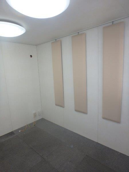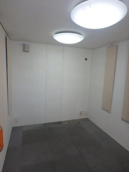 | 仕様 | 床:底床+GW+合板+中敷パネル+サイルシート・カーペット仕上げ 壁:木製遮音パネル・クロス仕上げ 天井:低吸音パネル・クロス仕上げ ドア:木製防音ドア(2重透明ガラス窓付き)・マグネットパッキン・一文字ハンドル 装備:照明(2ヶ所)・換気扇・2口コンセント・吸音パネル・高窓Sサッシ付 |