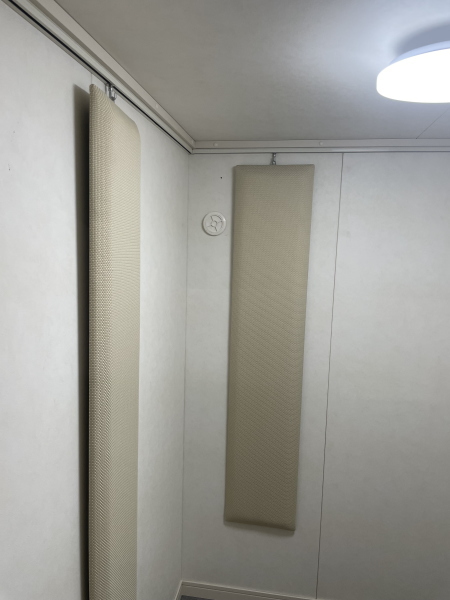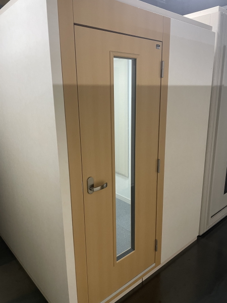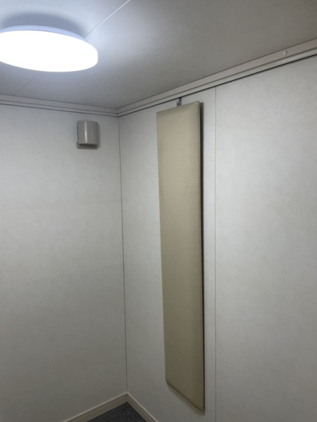 | 仕様 | 床:防振・防音浮床構造、床遮音補強マット2層、カーペット仕上げ 壁:遮音壁パネル、クロス仕上げ 天井:天井遮音パネル・クロス仕上げ ドア:木製防音ドア(2重透明ガラス窓付き)・マグネットパッキン・レバーハンドル 装備:照明・換気扇・2連スイッチ・2口コンセント・吸音パネル |