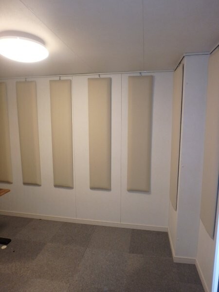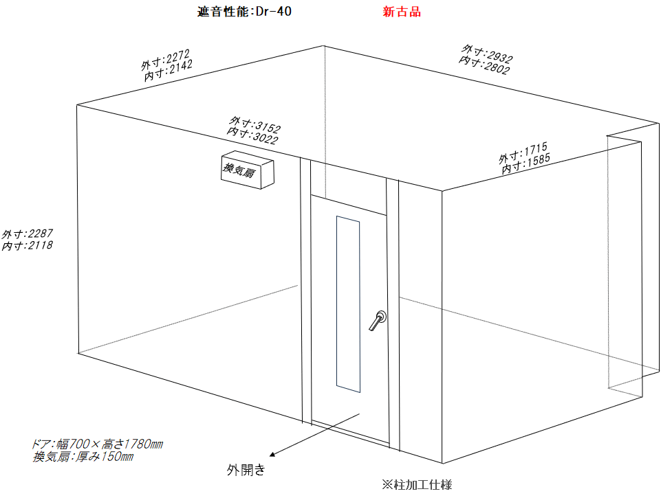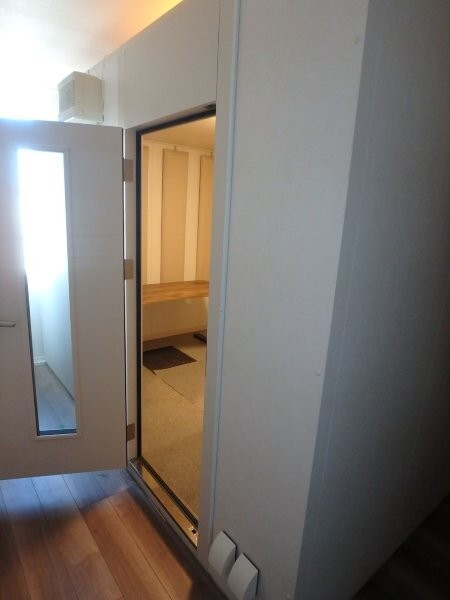 | 仕様 | 床:防振・防音浮き床浮上構造・タイルカーペット仕上げ 壁:遮音壁パネル、クロス(非塩ビ)仕上げ・壁掛け吸音パネル付き 天井:遮音天井パネル・天井低吸音パネルクロス仕上げ ドア:木製防音ドア(2重透明窓付き)・2重ゴムパッキン使用・グレモンハンドル 装備:照明・換気扇・2口コンセント・吸音パネル |