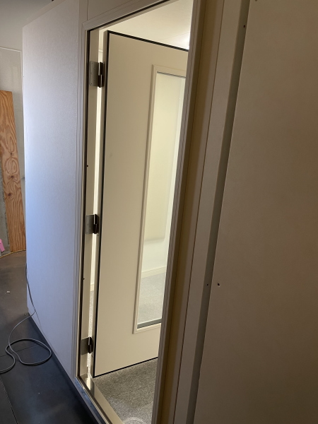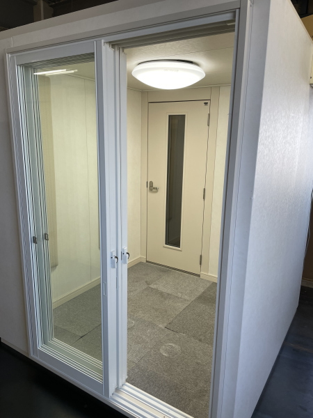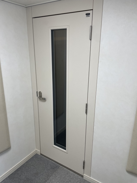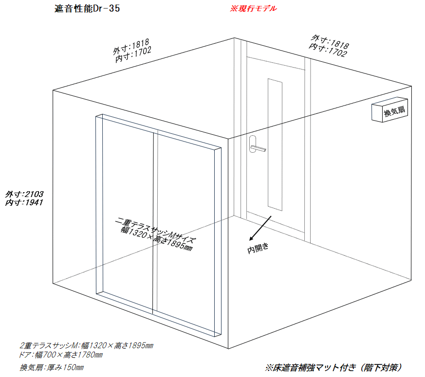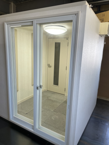 | 仕様 | 床:防振・防音浮き床(底床+GW+仕上げ合板+サイルシート2層+カーペット仕上げ) 壁:木製遮音パネル・クロス仕上げ 天井:低音吸音パネル・内部化粧板仕上げ 開口部:2重テラシサッシMサイズ +木製防音ドア(2重透明ガラス窓付き)・マグネットパッキン・レバーハンドル 装備:照明・換気扇・2口コンセント・吸音パネル |