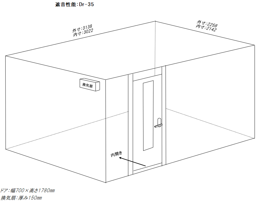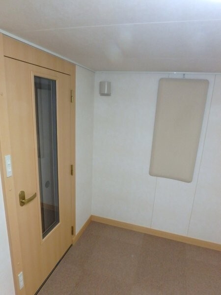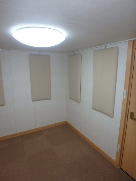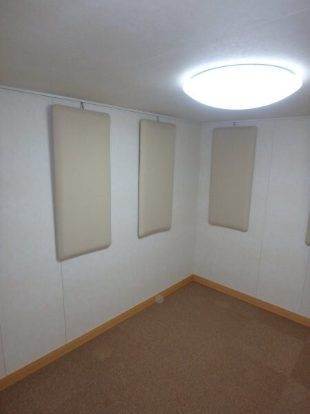 | 仕様 | 床:床下合板・防振・遮音浮き床・タイルカーペット仕上げ 壁:木製遮音パネル・クロス仕上げ 天井:クロス仕上げ・低音吸音パネル・内部化粧板仕上げ ドア:木製防音ドア(2重透明ガラス窓付き)・マグネットパッキン・レバーハンドル 装備:照明・換気扇・2口コンセント・吸音パネル |