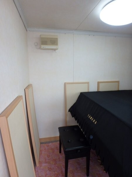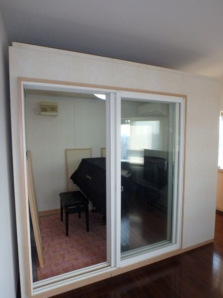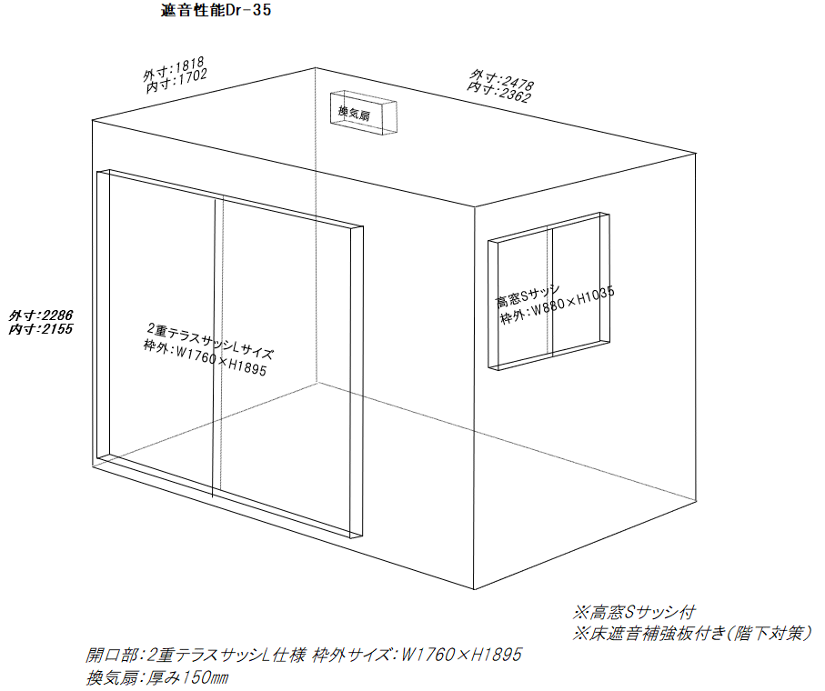 | 仕様 | 床:防振浮床構造・床遮音補強板・カーペット仕上げ 壁:遮音パネル・クロス(非塩ビ)仕上げ 天井:遮音パネル・クロス(非塩ビ)仕上げ 開口部:2重テラスサッシLサイズ 装備:照明・換気扇・2口コンセント・高窓Sサッシ・吸音パネル |