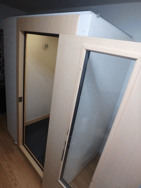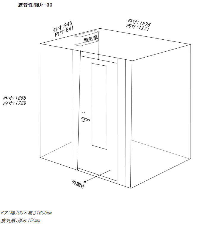 | 仕様 | 床:複合式床パネル・カーペット仕上げ 壁:遮音壁パネル・クロス(非塩ビ)仕上げ 天井:吸音天井パネル・吸音クロス仕上げ ドア:木製防音ドア(2重透明ガラス窓) 装備:照明・換気扇・2連スイッチ・2口コンセント |