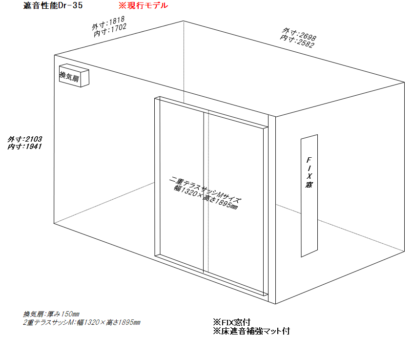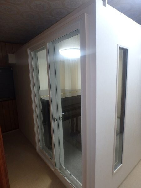 | 仕様 | 床:防振、防音浮き床(底床+GW+仕上げ合板+サイルシート2層・カーペット仕上げ) 壁:木製遮音パネル・クロス仕上げ 天井:低音吸音パネル・内部化粧板仕上げ 開口部:2重テラスサッシMサイズ 装備:換気扇・2口コンセント・照明・吸音パネル・FIX窓 |