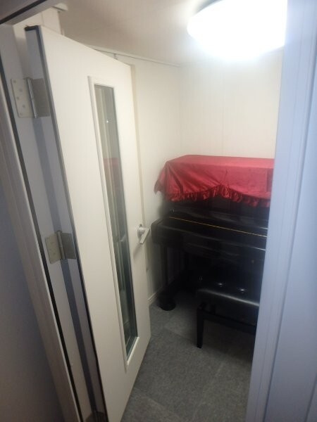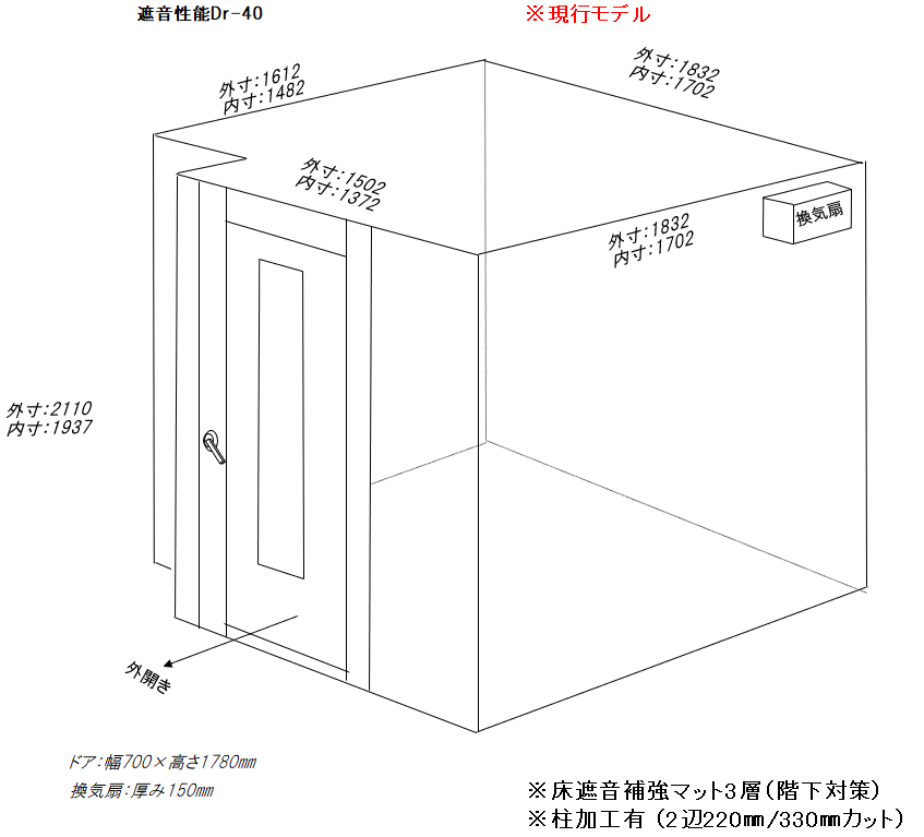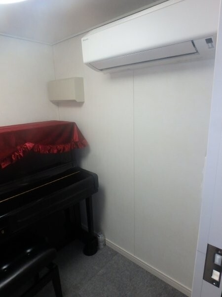 | 仕様 | 床:防振浮き床浮上構造・床補強遮音マット3層・カーペット仕上げ 壁:木製遮音パネル、クロス仕上げ 天井:低吸音パネル・内部化粧板仕上げ ドア:木製防音ドア(2重透明窓付き)・2重ゴムパッキン使用・グレモンハンドル 装備:照明・換気扇・2口コンセント・吸音パネル |