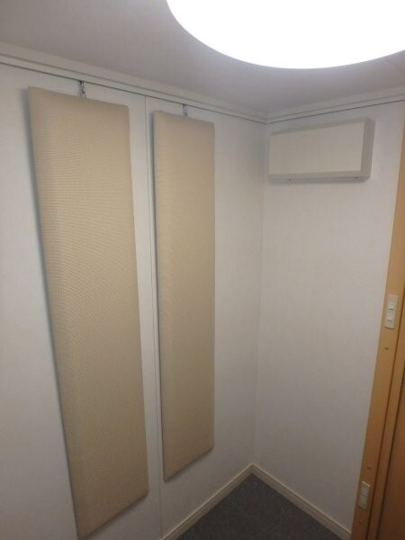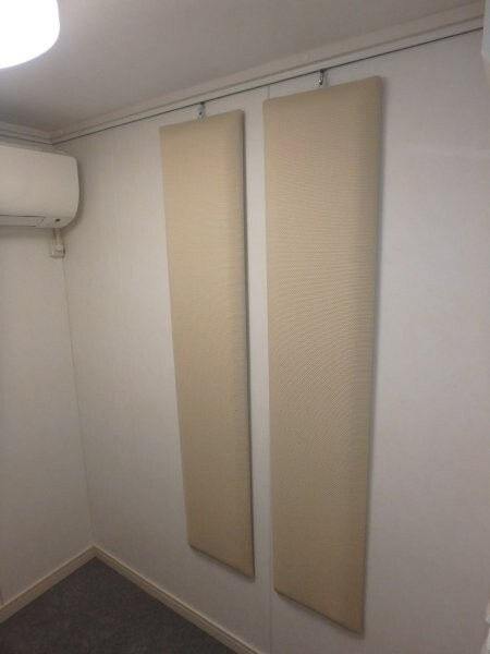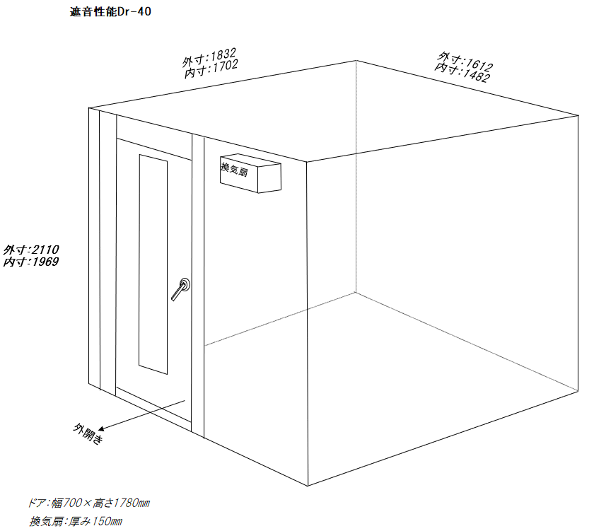 | 仕様 | 床:防振・防音浮床構造、サイルシート2層、カーペット仕上げ 壁:壁遮音パネル(クロス仕上げ) 天井:天井換気遮音パネル(クロス仕上げ) ドア:木製防音ドア(2重透明ガラス窓付き)・2重ゴムパッキン・グレモンハンドル 装備:換気扇・2口コンセント・照明・吸音パネル |