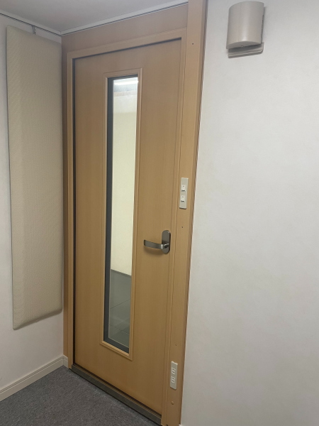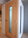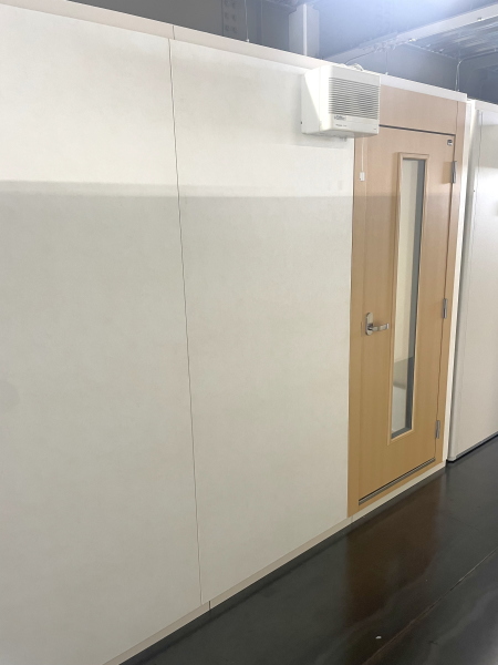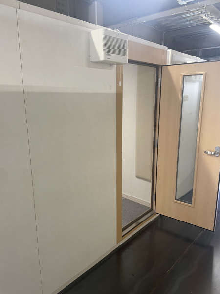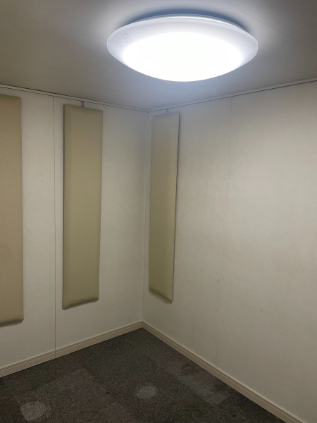 | 仕様 | 床:防振、防音浮き床(底床+GW+合板)サイルシート1層、カーペット仕上げ 壁:遮音パネル(クロス仕上げ) 天井:天井遮音パネル(クロス仕上げ) 開口部:木製防音ドア(2重透明ガラス窓付き)・マグネットパッキン・レバーハンドル 装備:照明・換気扇・2口コンセント・吸音パネル |