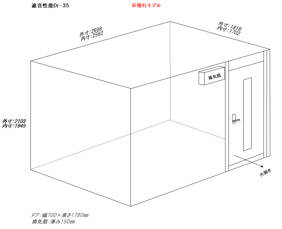 外寸:1818(換気扇+150)×2698×2103㎜ 内寸:1702×2582×1945㎜ |