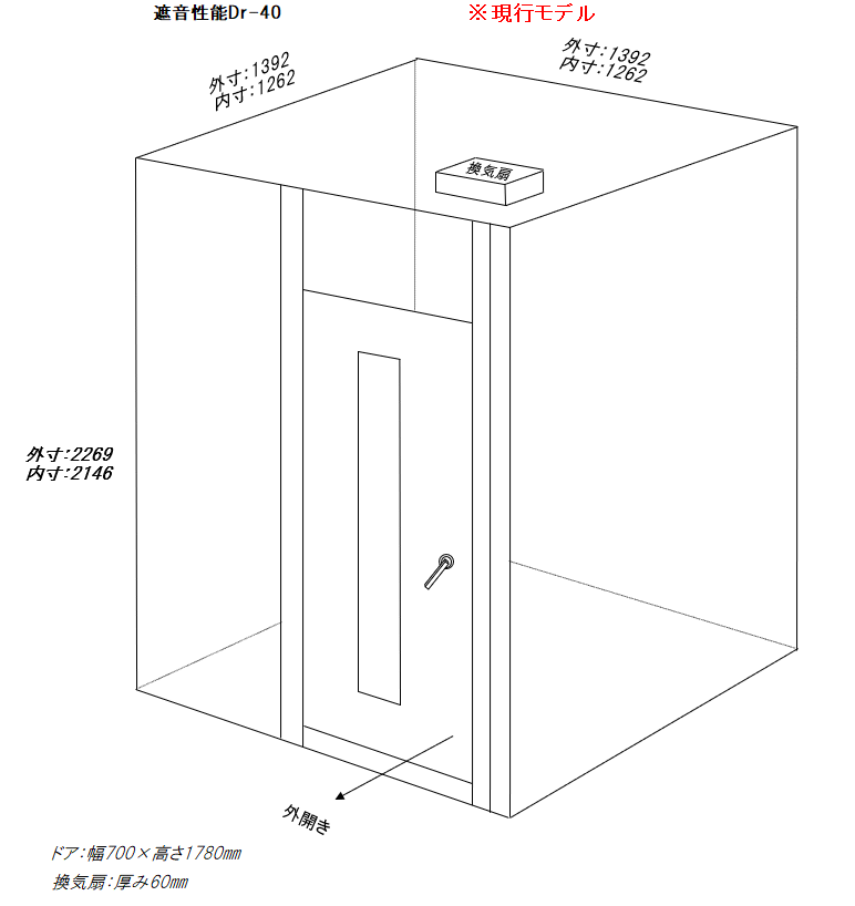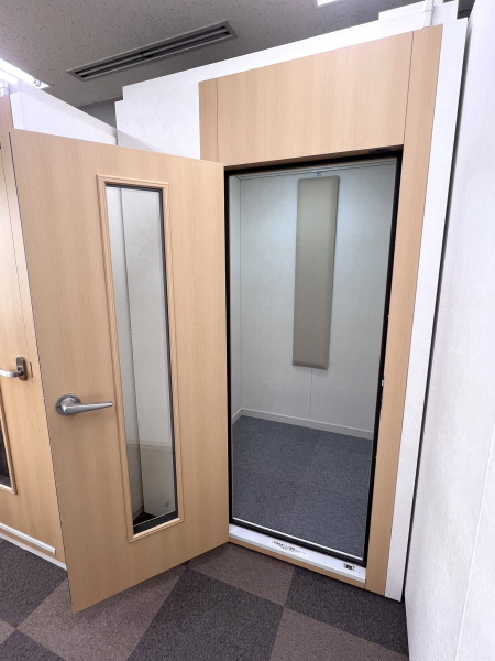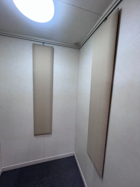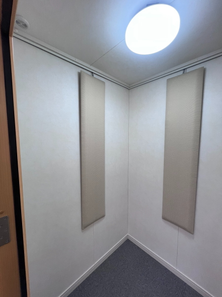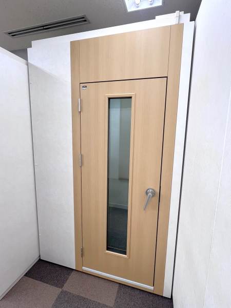 | 仕様 | 床:防振・防音浮床、カーペット仕上げ 壁:壁遮音パネル(クロス仕上げ) 天井:天井換気遮音パネル(クロス仕上げ) ドア:木製防音ドア(2重透明ガラス窓付き)・2重ゴムパッキン使用・グレモンハンドル 装備:換気扇・2口コンセント・照明・吸音パネル |