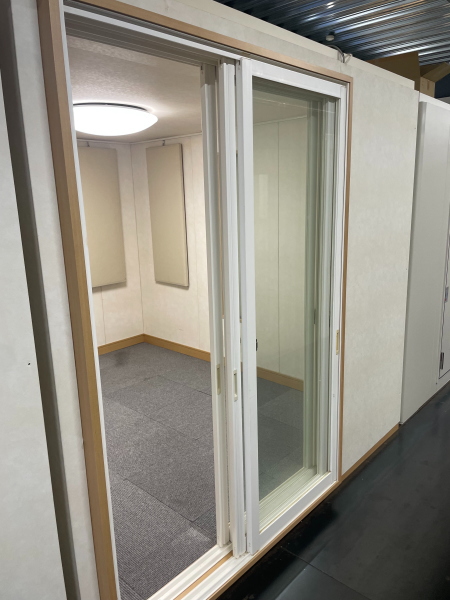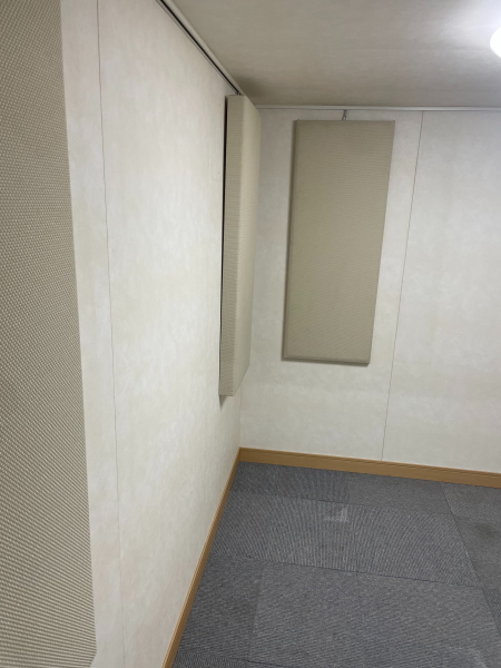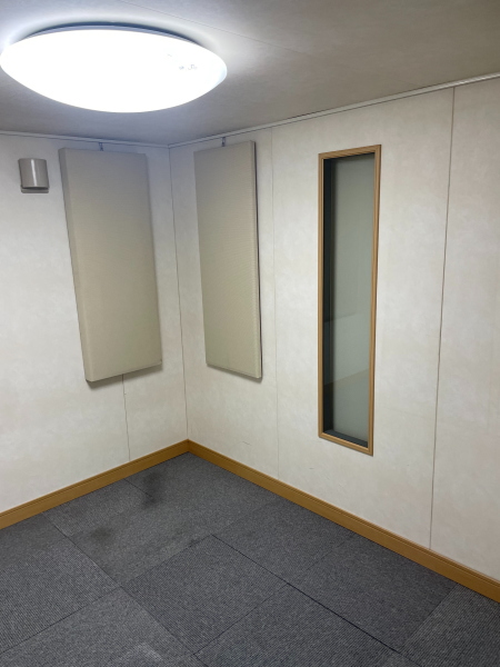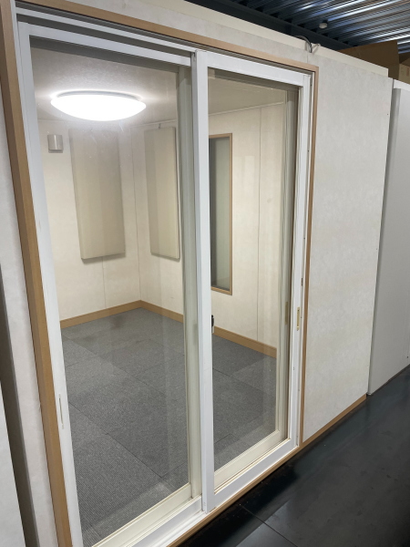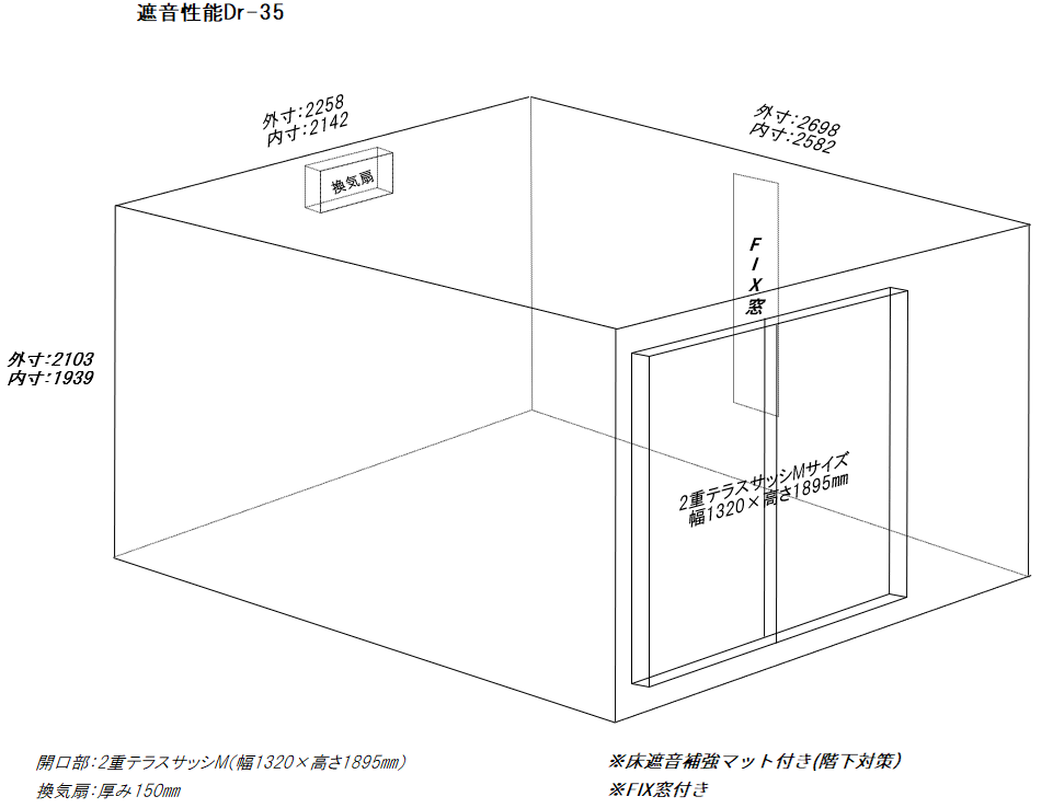 | 仕様 | 床:防振・遮音浮き床、遮音床補強マット2層・カーペット仕上げ 壁:クロス仕上げ・遮音パネル 天井:クロス仕上げ・遮音パネル 開口部:2重テラスMサイズ 装備:照明・換気扇・2口コンセント・吸音パネル・FIX窓 |