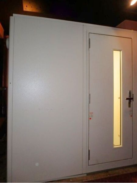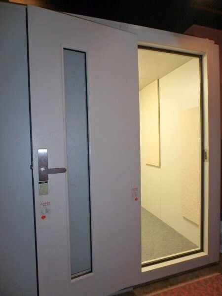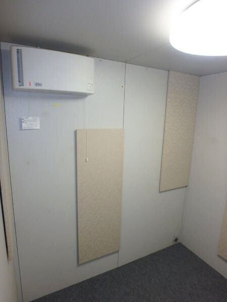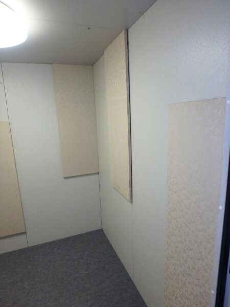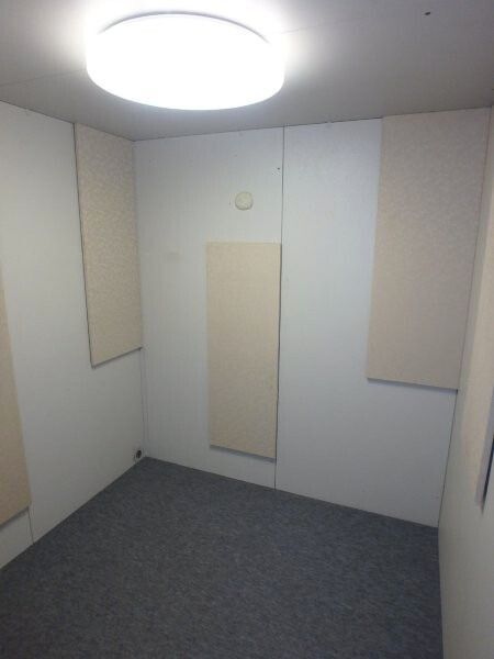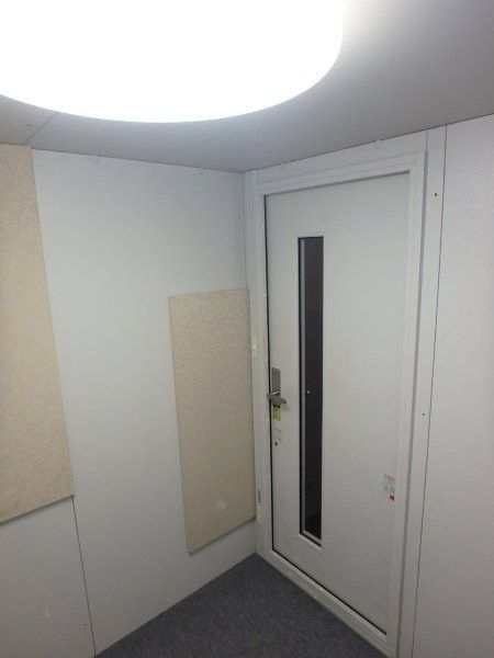 | 仕様 | 床:床フレーム+遮音床パネル カーペット仕上げ 壁:遮音壁パネル 内外装仕上げ:強化化粧紙(パールホワイト色) コーナー/化粧カバー:パールホワイト 天井:遮音天井パネル 内外装仕上げ:強化化粧紙(パールホワイト色) ドア:木製防音ドア(透明ガラス窓付き)・表面:強化化粧紙仕上げ(パールホワイト色) 装備:換気扇・2口コンセント・照明・音場パネル |