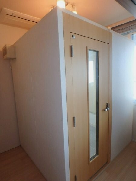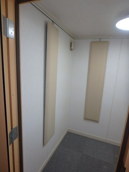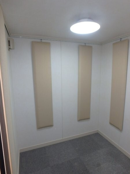| 仕様 | 床:防振・防音浮床、タイルカーペット仕上げ 壁:遮音壁パネル、クロス仕上げ 天井:天井遮音パネル・クロス仕上げ ドア:木製防音ドア(2重透明ガラス窓付き)・マグネットパッキン・レバーハンドル 装備:照明・換気扇・2連スイッチ・2口コンセント・吸音パネル・FIX窓 |