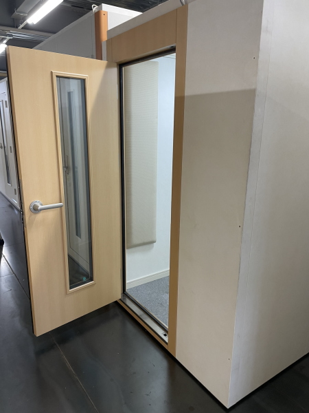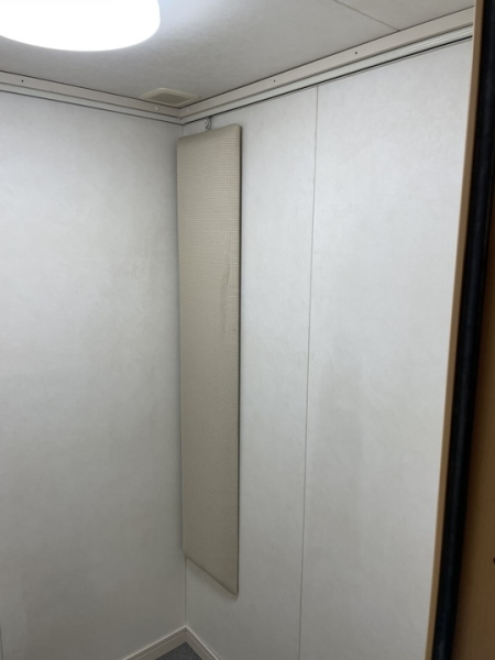 | 仕様 | 床:遮音床、タイルカーペット仕上げ 壁:壁遮音パネル(クロス仕上げ) 天井:天井換気遮音パネル(クロス仕上げ) ドア:木製防音ドア(2重透明ガラス窓付き)・2重ゴムパッキン・グレモンハンドル 装備:換気扇・2口コンセント・照明・吸音パネル |