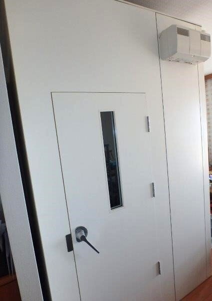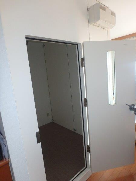 | 仕様 | 床:底床床・カーペット仕上げ 壁:遮音壁パネル 天井:遮音天井パネル ドア:木製防音ドア(透明窓付き) 装備:換気扇・2口コンセント |